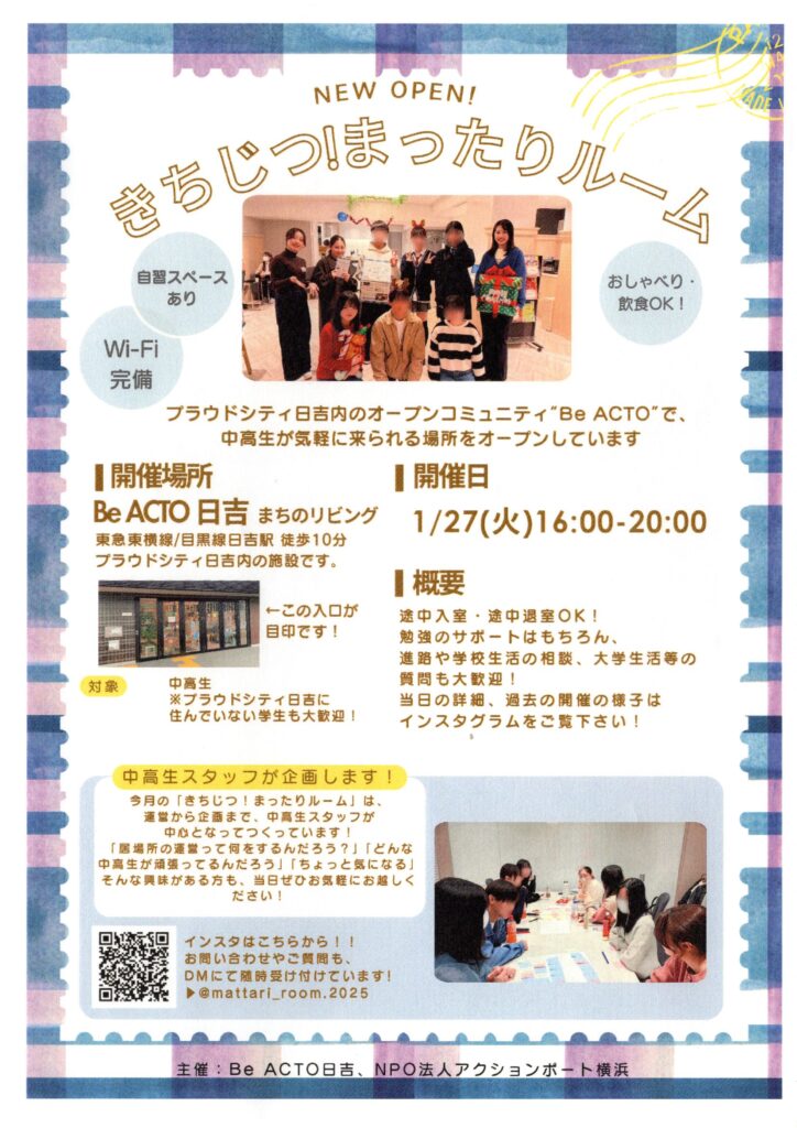 Be ACTO日吉に、中高生が立ち寄れる新しい居場所がオープン!!