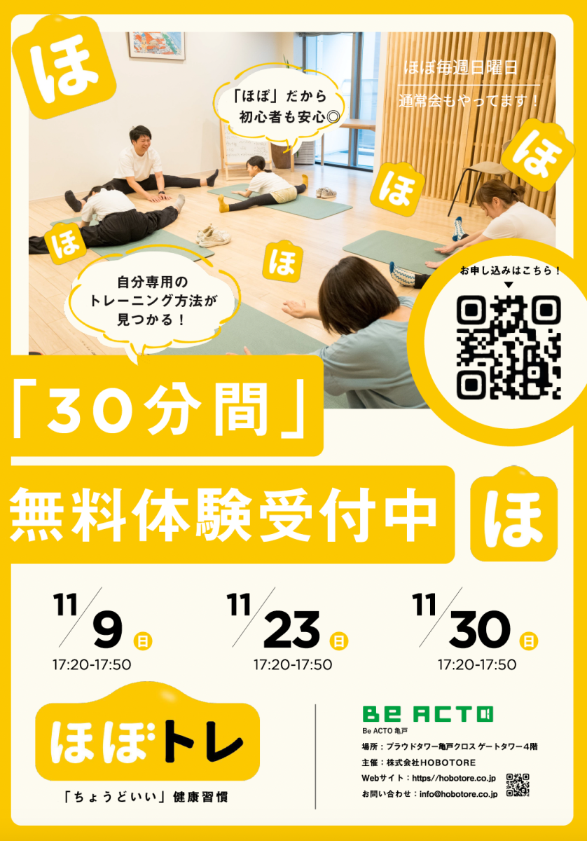 7月・8月・9月とたくさんの方にご参加いただいた30分の無料体験キャンペーン◎「運動のきっかけになった」「自分に合う方法が見つかった」など、大変ご好評をいただき11月も継続決定しました!