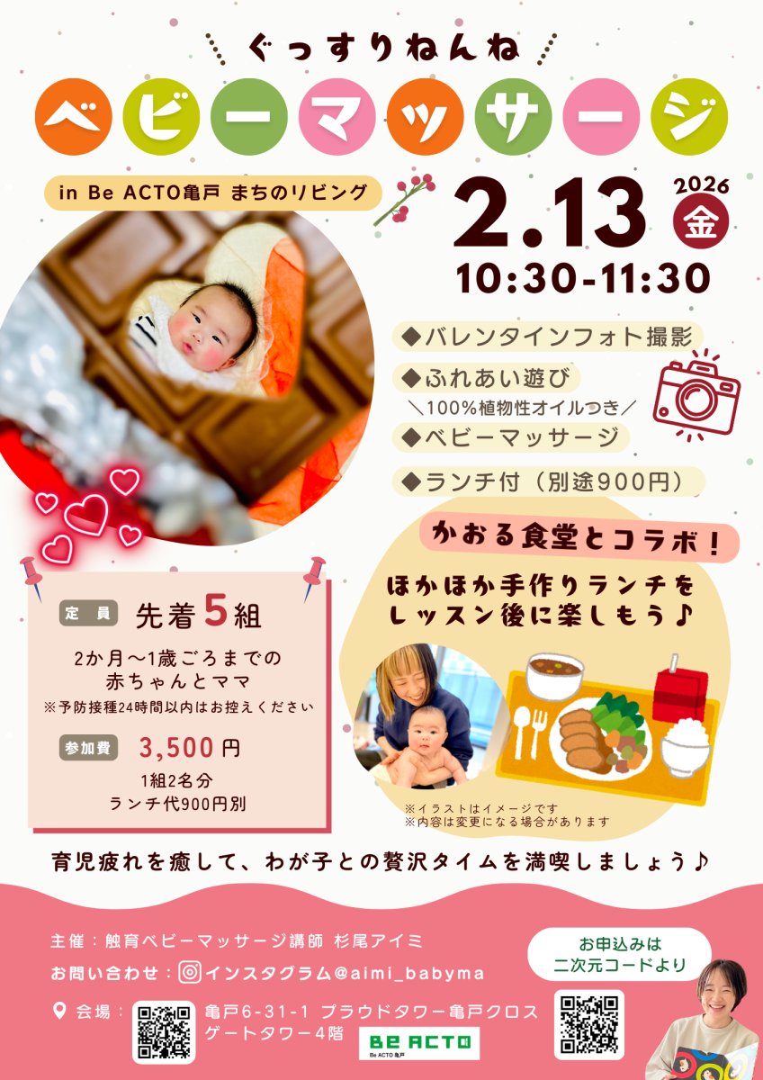 ★ 場所:Be ACTO亀戸 まちのリビング(プラウドタワー亀戸クロスゲートタワー4階) ~~~~~~~~ ★マッサージに参加したママの声 ・作ってもらった温かいごはんを、温かいうちに食べられる幸せ!わが子は寝てくれて、ママたちとおしゃべりしながらゆったり食べられて嬉しかったです(7か月・女の子) ・ご機嫌で楽しそうな声かけとお歌、そしてタッチングで愛情溢れる触れ合いができて、新しい接し方を学べました♪帰宅後に排便もあって効果かな〜と感じました!(2か月・女の子) ・なかなかお風呂以外で肌を直接さわることがないので、とても良い時間でした♪終わったあとからすぐに寝てゆっくり過ごせました。(3ヶ月・双子の女の子)