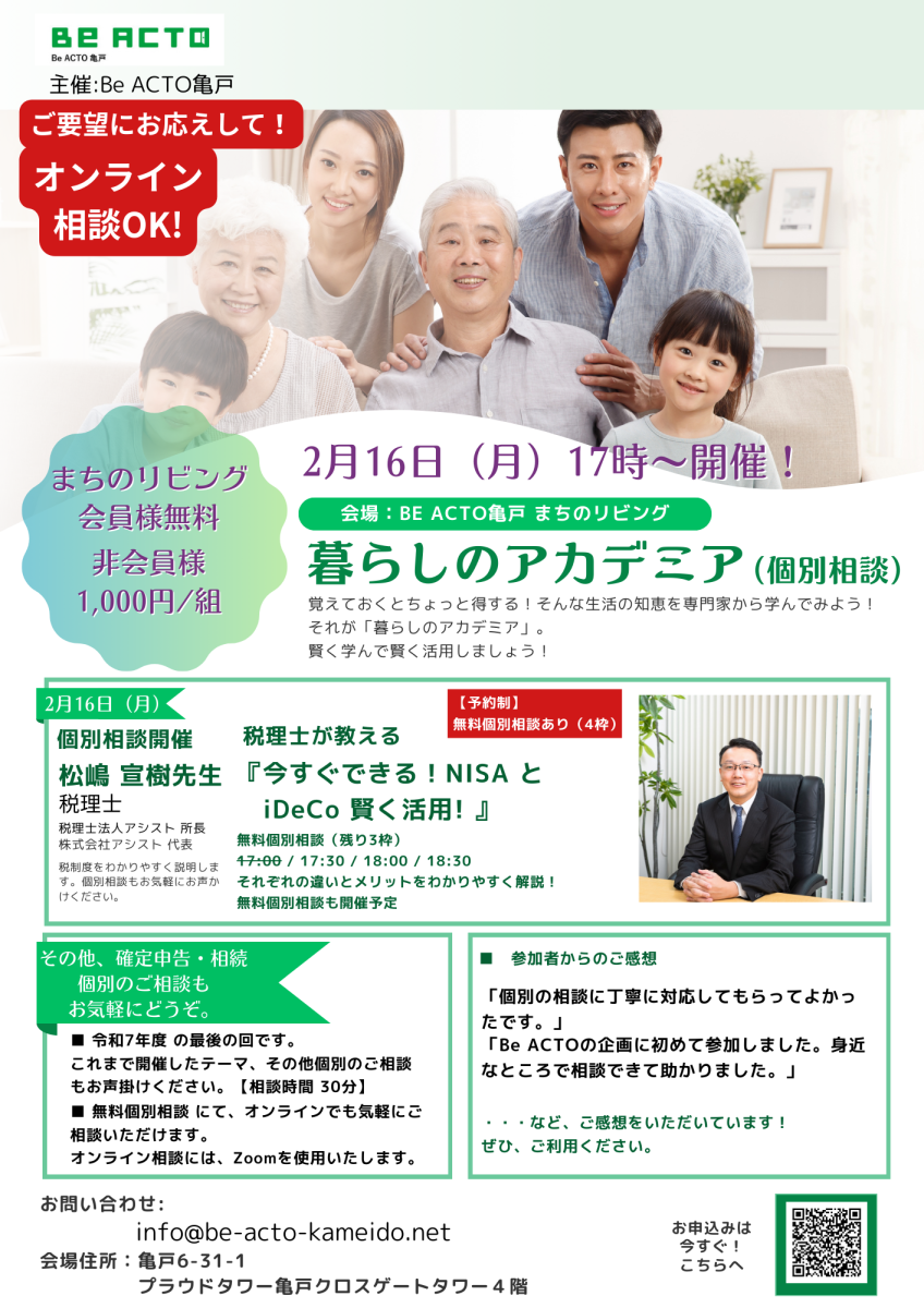 Be ACTO亀戸 暮らしのアカデミア 2026 「税理士が教える」シリーズです!