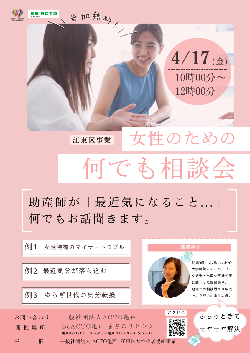 女性の皆さ~ん!Be ACTO亀戸まちのリビングでは、助産師の何でも相談会を開催いたします。